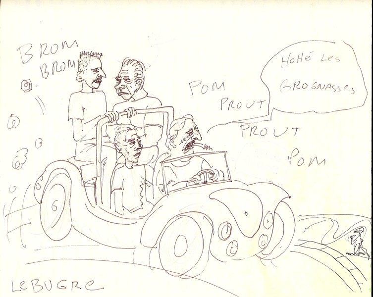 Michel et Grisé ont loué un Buggy ( Bugre ici) pour frimer en ville ce qui nous à permis de : prendre une averse cataractesque sur la gueule, trempés comme des souches d'entrée, tomber en panne deux fois déjà, la deuxième câble d'accélérateur cassé, Michel obligé d'actionner le papillon des gaz à la main directement sur le moteur (placé à l'arrière) pendant que Grisé conduit, se faire arrêter par les flics la nuit, obligés de payer un joli backshish pour repartir car évidemment les bougres sortent sans un papier en règle, se conduisent un Buggy surchargé entre autres par des tapineuses de rue, mais alors la toute belle radasse, assise jambes écartées sur le capot arrière la main de Grisé entièrement plongée dans la moulasse, tout ça en roulant sur Copacabana ! Ajoutons que dés qu'on s'arrête les momes des rues envahissent la caisse, obligés de la surveiller de longue…Bon, nous en avons profite pour faire une super balade au sommet de la foret de Tijuca, la jungle en plein Rio qui couvre les montagnes et c'est beau ! Ils ont fini par louer une bagnole normale pour remplacer le Buggy trop voyant, Grisé en a profité pour tester les tapineuses de rue de la fin de Copa, mais il n'a pas osé les travelos…